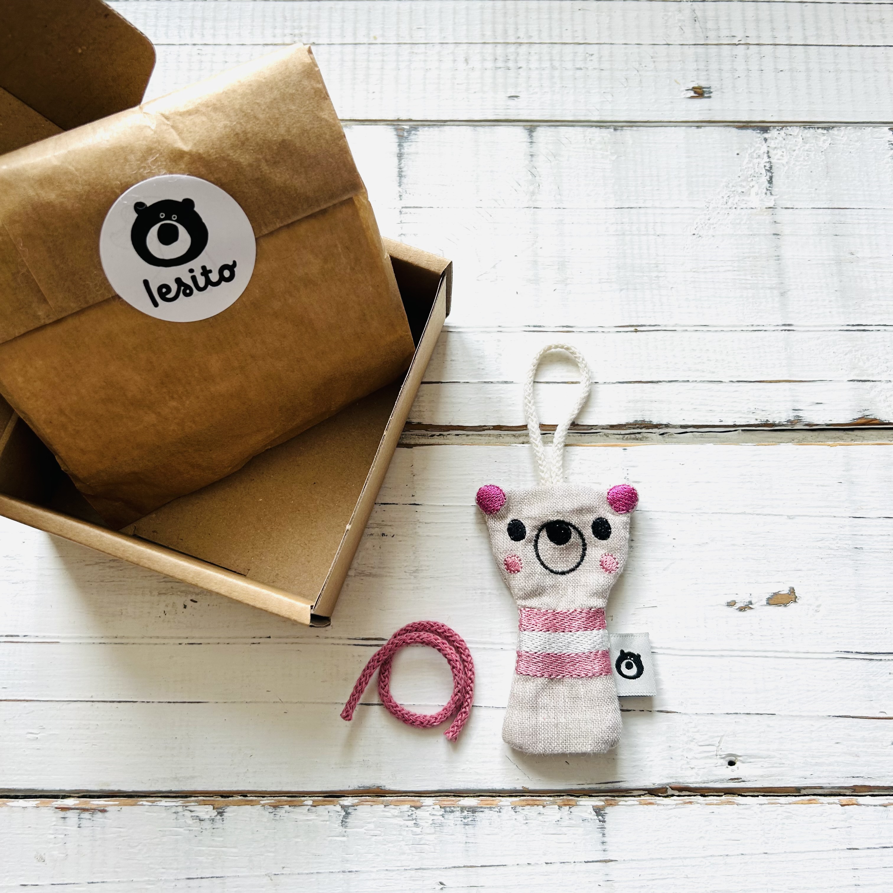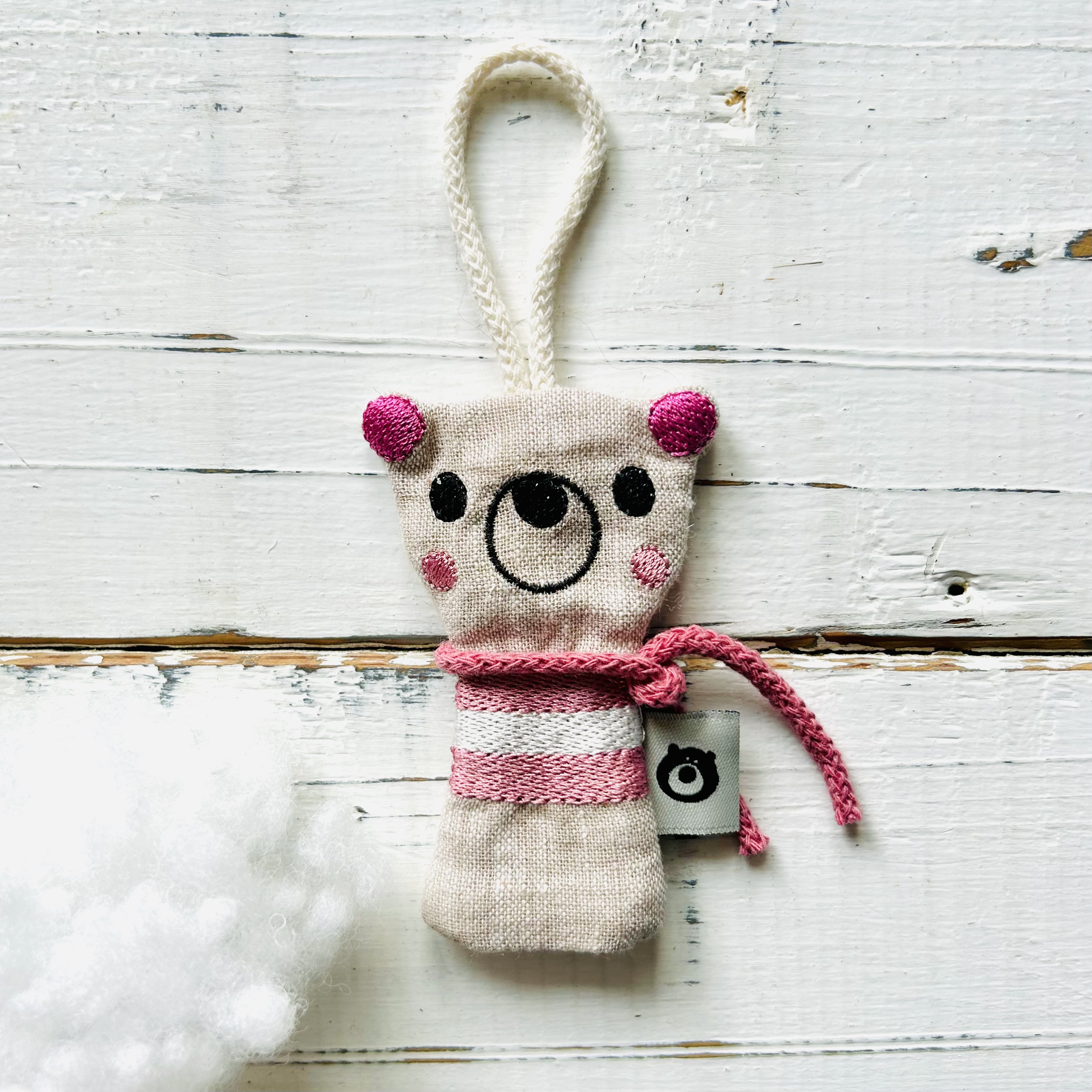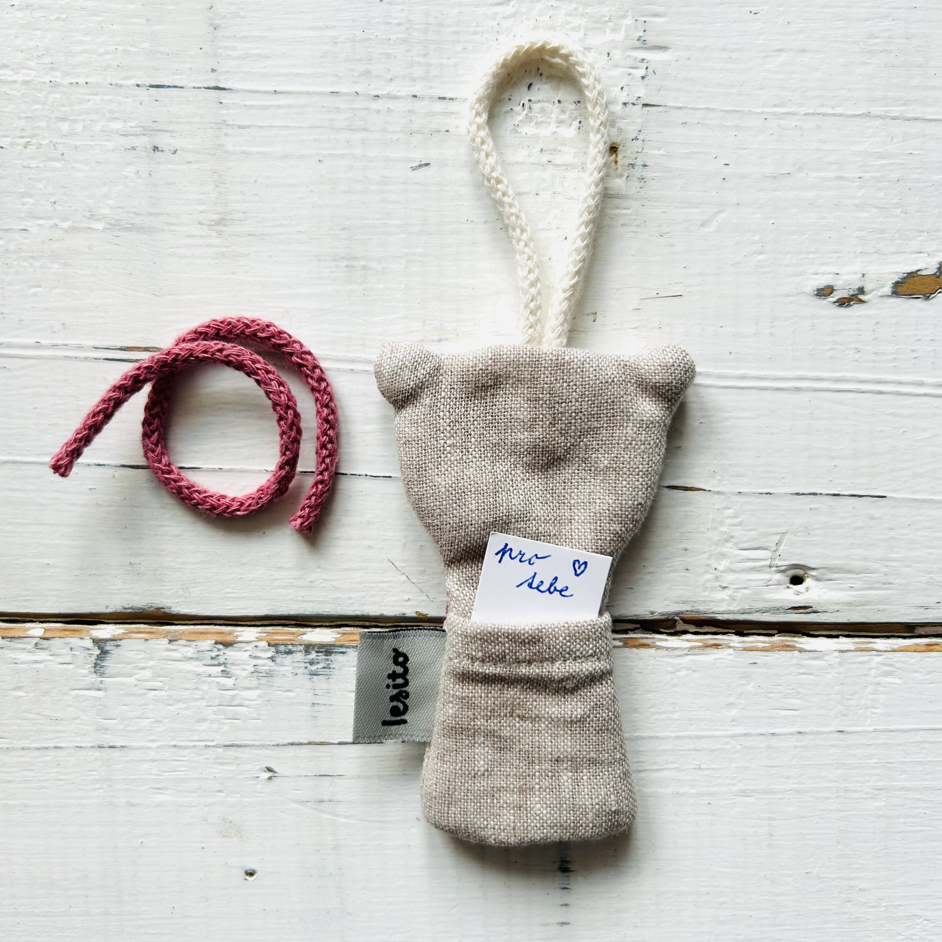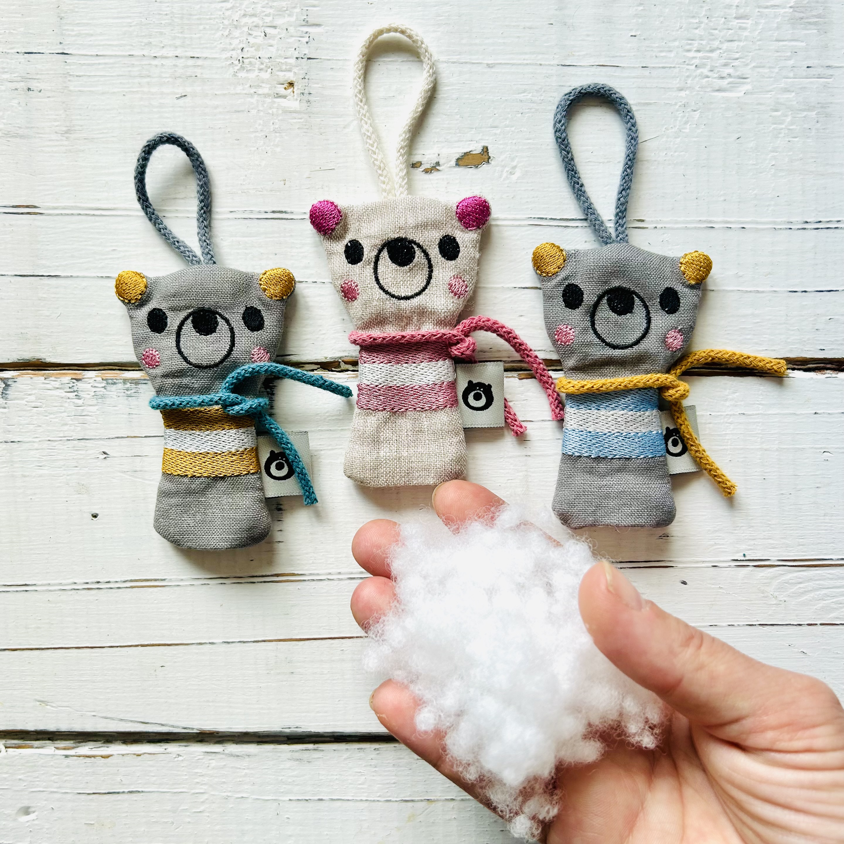 Hračka je ušitá ze 100% lněných látek. Tělo je vypodloženo výztuhou, aby lépe drželo tvar a bylo odolnější. Výplň je polyesterové duté vlákno. Hračku zdobí strojová výšivka. Provázek je bavlněný