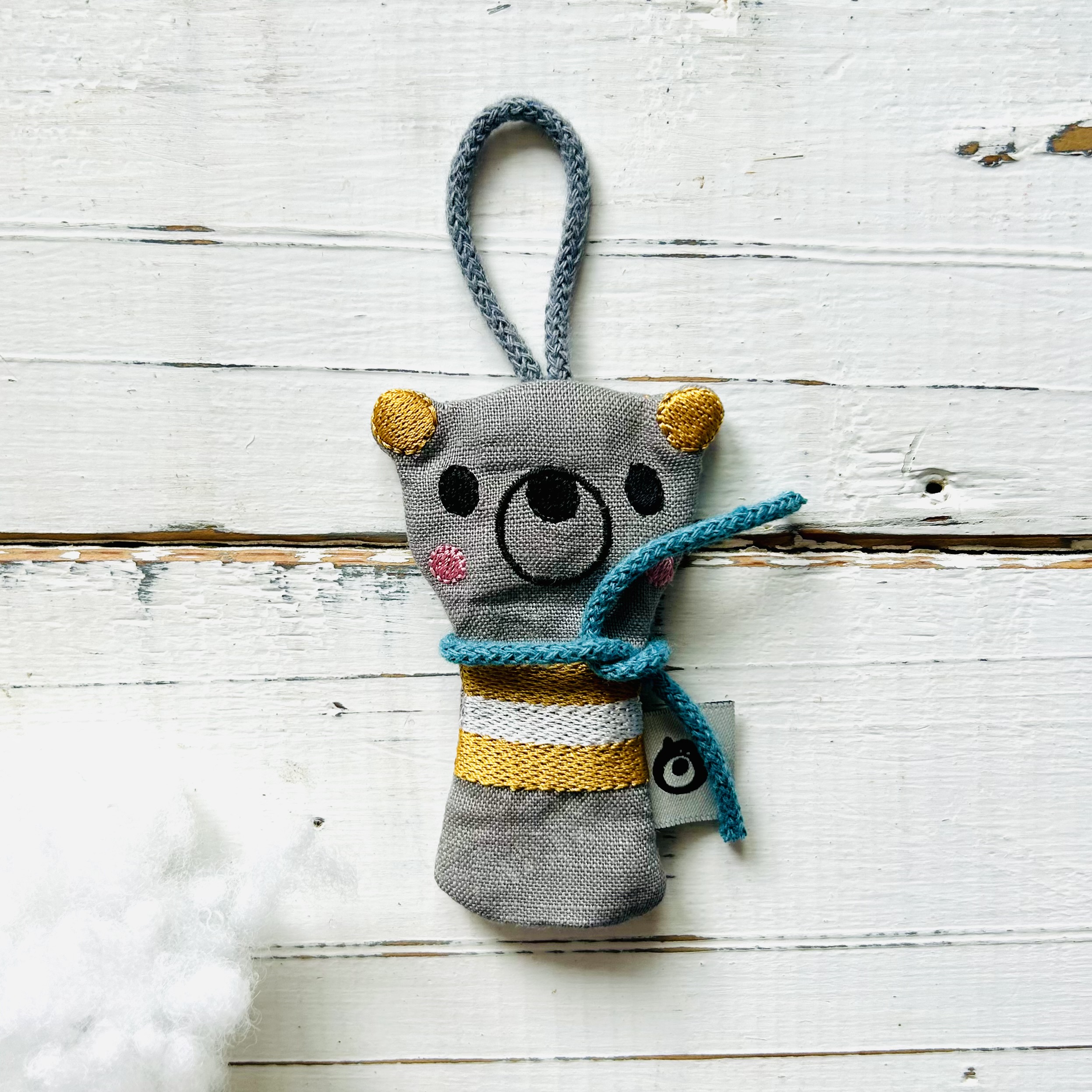 Hračka je ušitá ze 100% lněných látek. Tělo je vypodloženo výztuhou, aby lépe drželo tvar a bylo odolnější. Výplň je polyesterové duté vlákno. Hračku zdobí strojová výšivka. Provázek je bavlněný