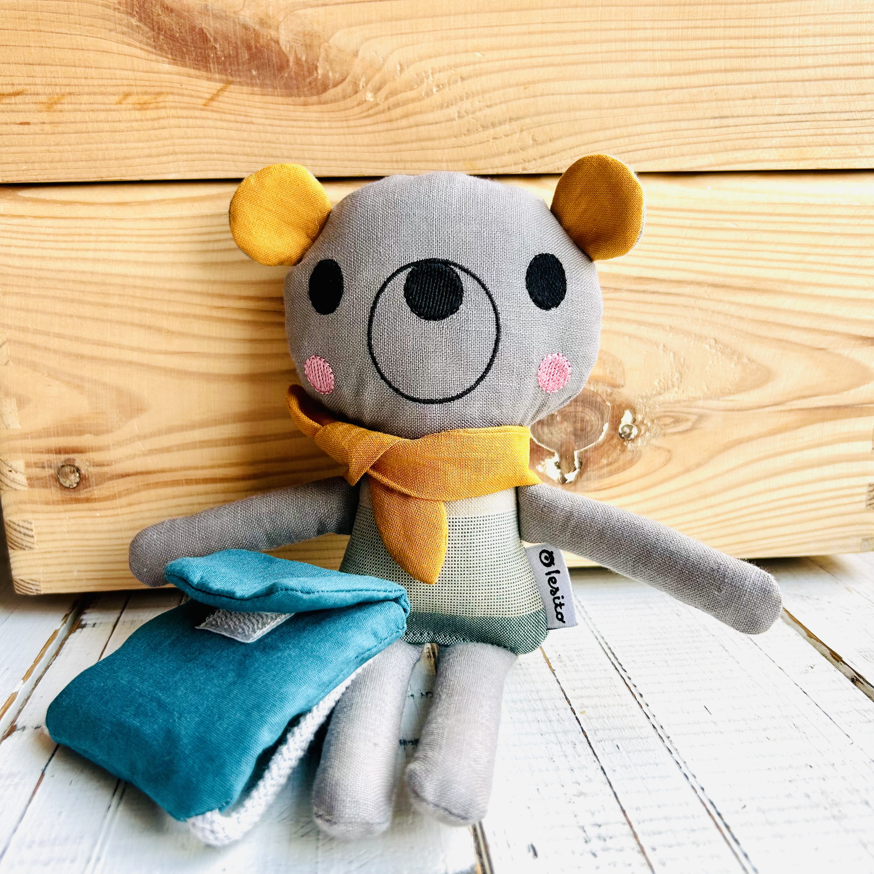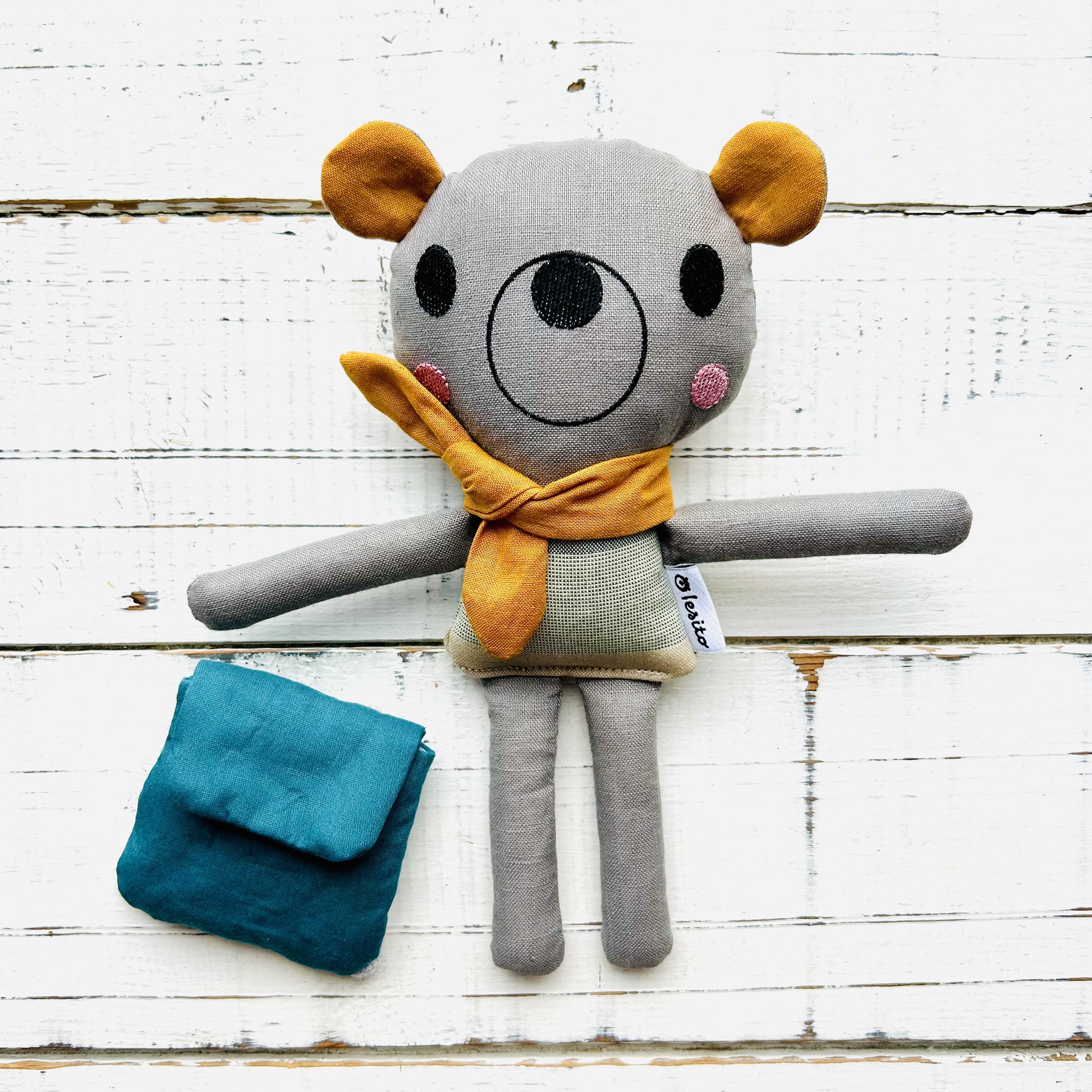 Hračka je ušitá ze 100% lněných látek a z bavlněných látek. Tělo, tlapky a uši jsou vypodloženy výztuhou, aby lépe držely tvar a byly odolnější. Vyplněn je polyesterovým dutým vláknem. Hračku zdobí strojová výšivka. Batoh a šáteček jsou bavlněné, vypodložené tenkou výztuhou. Batoh se zapíná na suchý zip (100% polyester), popruhy jsou bavlněné.