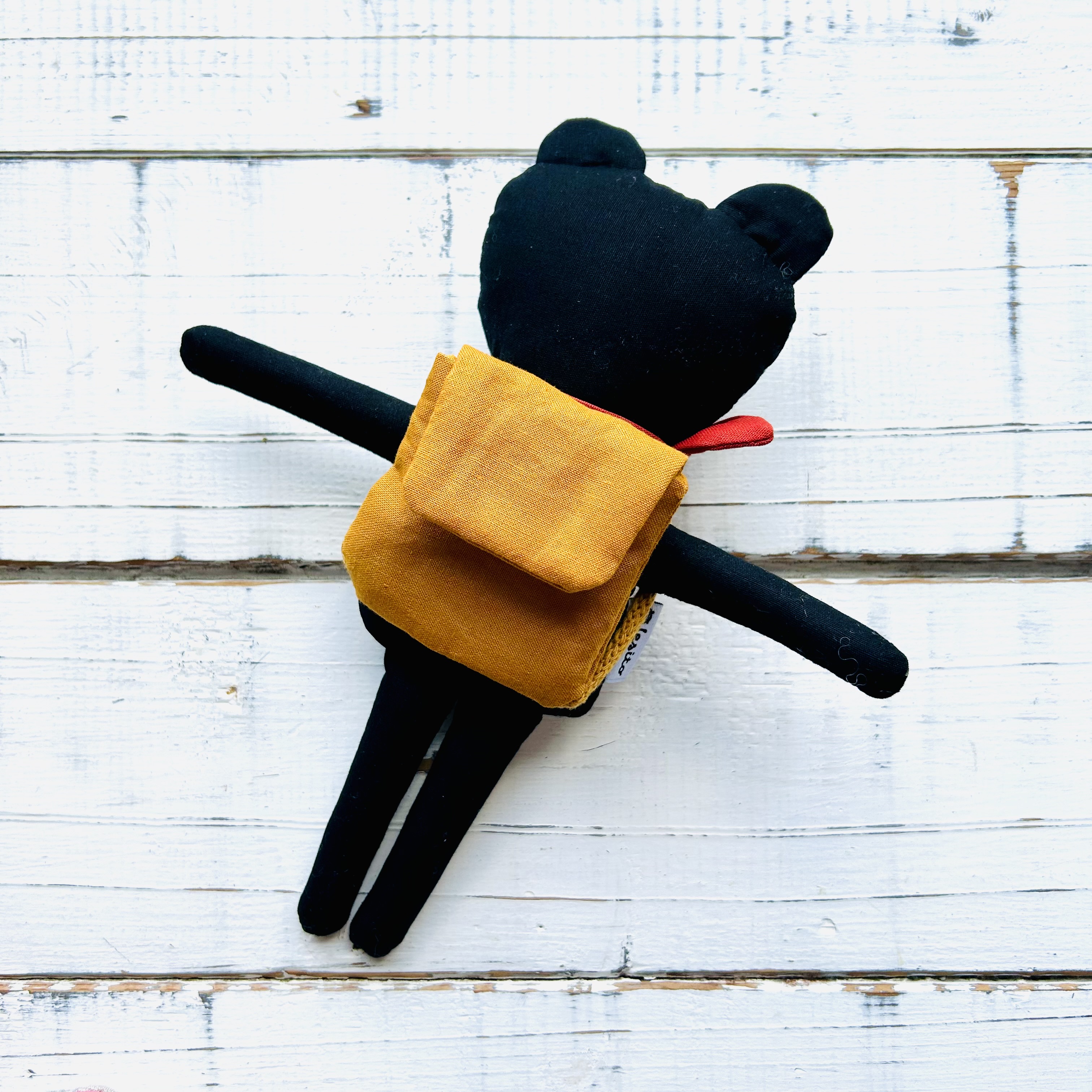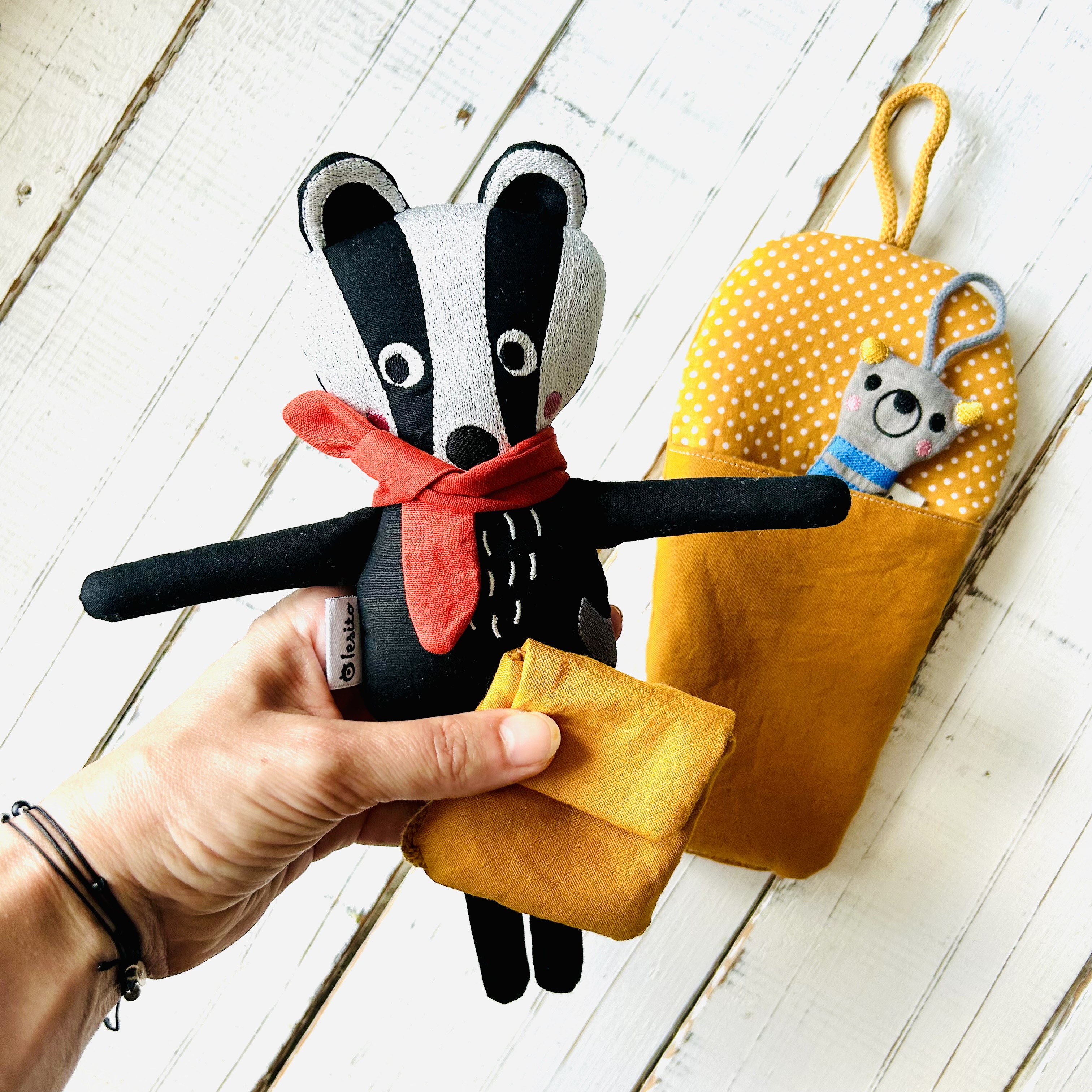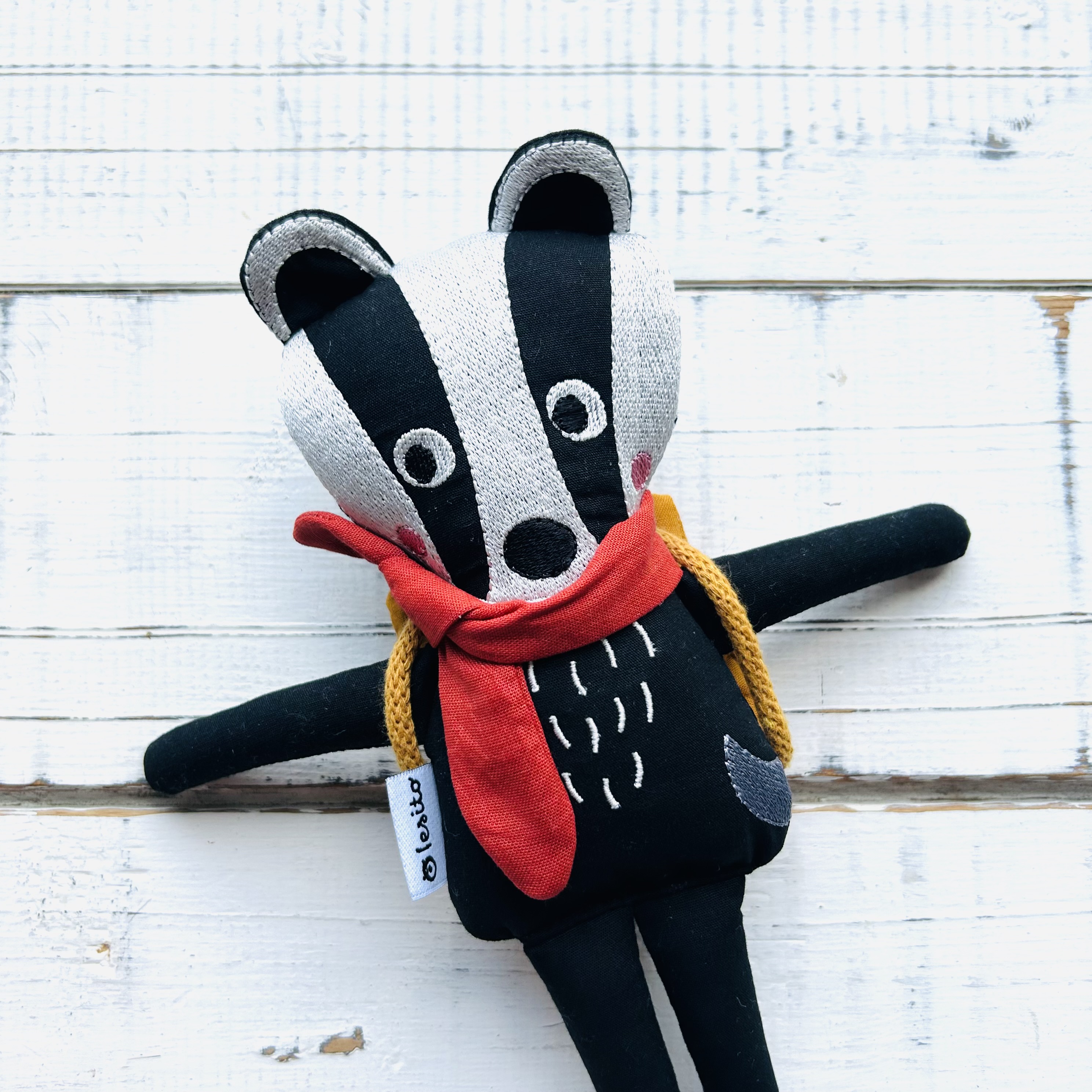Hračka je ušitá ze 100% lněných látek a z bavlněných látek. Tělo, tlapky a uši jsou vypodloženy výztuhou, aby lépe držely tvar a byly odolnější. Vyplněn je polyesterovým dutým vláknem. Hračku zdobí strojová výšivka. Batoh a šáteček jsou bavlněné, vypodložené tenkou výztuhou. Batoh se zapíná na suchý zip (100% polyester), popruhy jsou bavlněné. Spacák je bavlněný, uvnitř je výztuha (100% polyester).