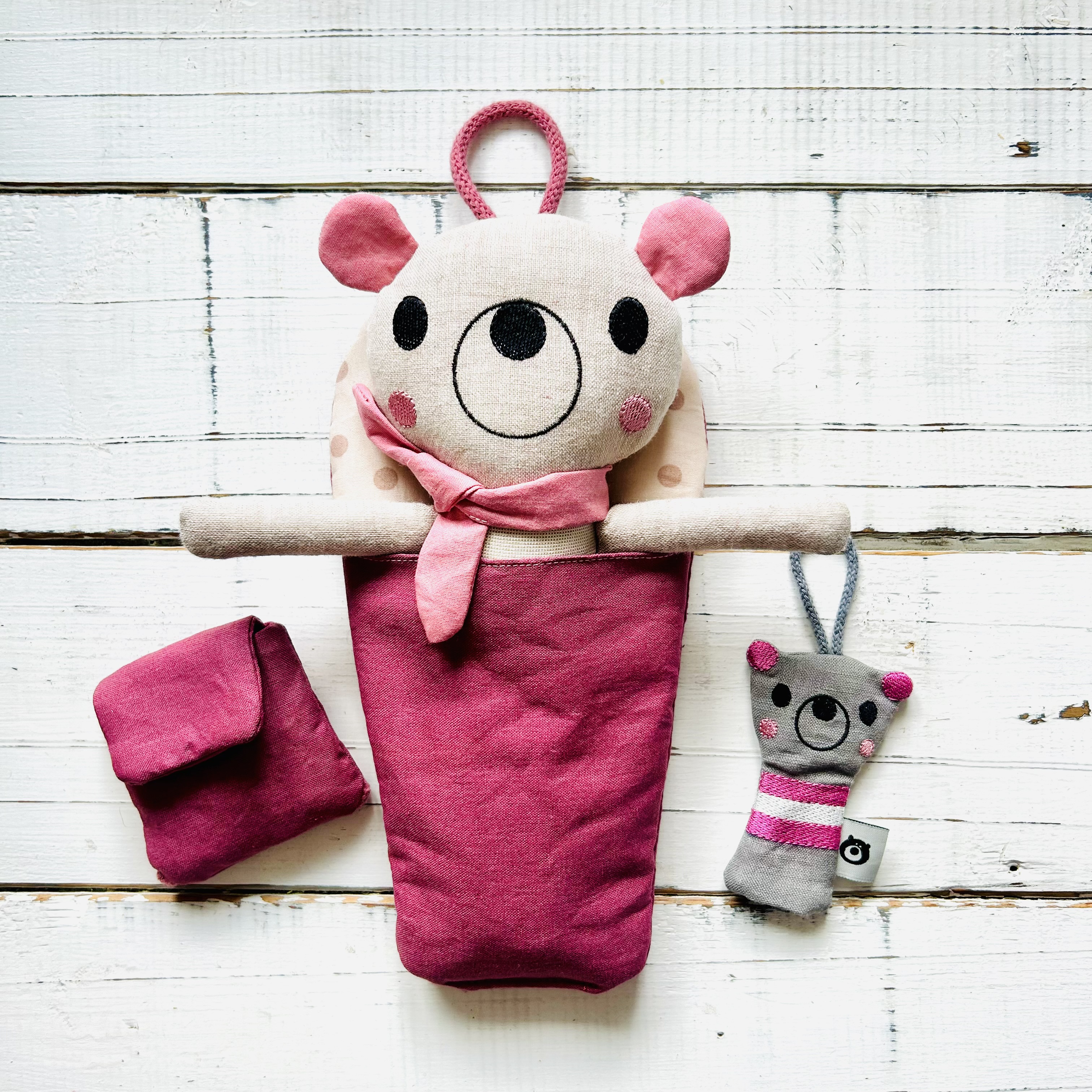 Hračka je ušitá ze 100% lněných látek a z bavlněných látek. Tělo, tlapky a uši jsou vypodloženy výztuhou, aby lépe držely tvar a byly odolnější. Vyplněn je polyesterovým dutým vláknem. Hračku zdobí strojová výšivka. Batoh a šáteček jsou bavlněné, vypodložené tenkou výztuhou. Batoh se zapíná na suchý zip (100% polyester), popruhy jsou bavlněné. Spacák je bavlněný, uvnitř je výztuha (100% polyester).